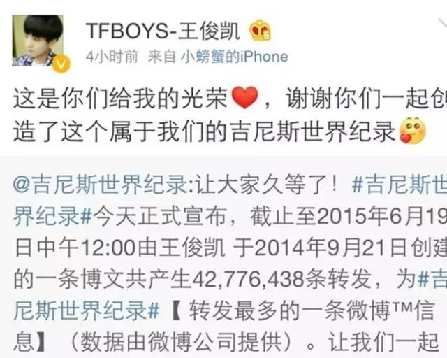 概而言之,一个人转发多次或者一个人养多个小号转发多次助力王俊凯斩获了世界纪录。