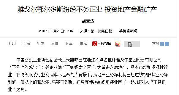 总之,这些年雅戈尔的鼻子确实很灵,哪里嗅到钱味它就扑向哪里,极具资本的“狼性”;从制造业起家,在制造业利润下滑时又转向更能赚钱的房地产、金融和旅游,也是摸准了中国改革开放三十年来的产业兴衰脉搏,获得巨大的利润。当然,飚车太快也不免引起非议,于是,既出现了服装业界对其“不务正业”的批评,也发生了杭州部分购房者因抗议雅戈尔炒作抬高杭州房价而发起的“抵制雅戈尔”事件(2010)。