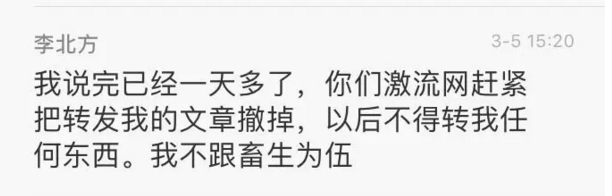 3月18日,激流网编辑部收到了李北方先生寄送的律师函,要求我们删除网站上转载的他的文章并公开道歉。在寄送律师函之后,李北方先生继续在微信公众号、微信群和朋友圈等公众平台对我们进行无理攻击和谩骂,对编辑部和读者造成了极大的困扰。为保证我们网站工作得以正常进行,我们于3月19日下午3时暂时删除了网站上所有李北方先生撰写的文章。而对于其要求我们道歉的无理要求,我们绝不答应。同时,对于李北方先生对我们编辑部和读者进行人格侮辱的行为,我们保留追究其法律责任的权利。