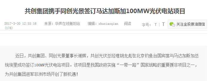 共创集团旗下公司湖南共创光伏科技有限公司成立于2009年7月23日。