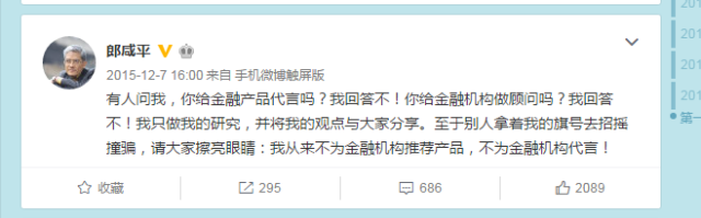 他表示:“从不为金融机构推荐产品,也不为金融机构代言”,极力撇清与其“站台”的大型平台的关系。