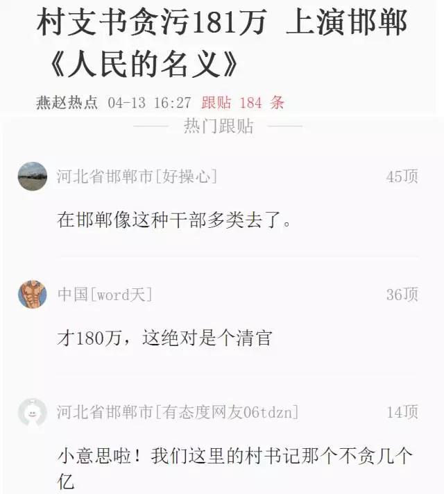 可以参考邯郸某位村支书,因为贪污180多万被抓住后,新闻下面的评论。根据这些评论,村支书这个职位,是个大金矿啊。