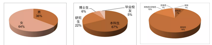 此次调查共回收了来自北京大学的190条记录。受访者中,男性占35.7%,女生占64.3%。在教育阶段的分布上,调查涵盖了从本科到博士、毕业后的各阶段,以本科生为主。在性取向的构成上,四分之三(76%)为异性恋者,双性恋/泛性恋占15%,同性恋占7%,无性恋和性取向未知的参与者各占1%。