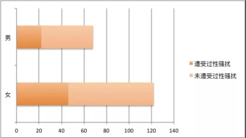 在填写问卷的190名受访者中,有三成以上(35.8%,68人)遭受过各种形式的性骚扰,其中超六成(66.0%)遭遇过两种形式及以上的性骚扰。在性别构成上,女性更容易成为性骚扰的受害者:此次调查中女性受害者占全部受害者的6成以上(66.3%),女性受害者占参与调查的女性的比例(37.7%)略高于男性受害者(32.4%)。