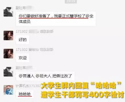 日前,网友曝料,江苏省盐城技师学院某学生,因在群内回复学生干部“哈哈哈”三字,被罚写400字检讨。
