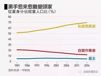 由从业身份的数字来看,台湾雇主人数比例下滑,老板越来越少,资本越来越集中化。