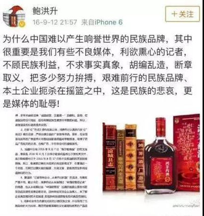 鸿茅药酒董事长鲍洪升2016年的一条微博