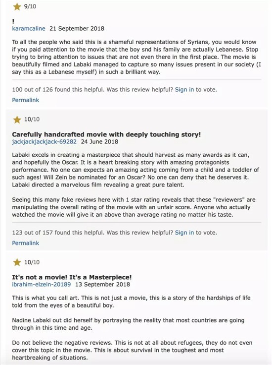 @karamcaline:对于所有那些说这是“叙利亚人可耻”的人来说,如果你关注这部电影,你就会知道这个男孩和他的家人实际上是黎巴嫩人。不要把注意力放在根本不存在的问题上。这部电影拍得很漂亮,导演拉巴基以如此出色的方式捕捉了我们社会中存在的许多问题(我自己也是黎巴嫩人)。