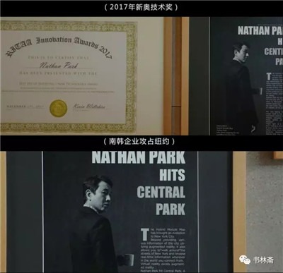 片头,当穷人家的小孩去他家时,就看到了墙上的奖状:新奥技术奖,以及《南韩企业攻占纽约》的报道。