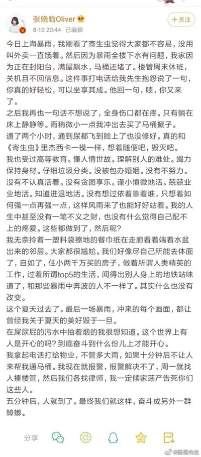 简单说,张作家刚刚看完韩国电影《寄生虫》,然后发现家里的马桶坏了,打电话向物业报修,物业休息,张作家就自己和马桶奋战了两个小时,甚至尿水都溅到脸上,然后就情绪崩溃了,以报警相威胁,要求物管必须来……