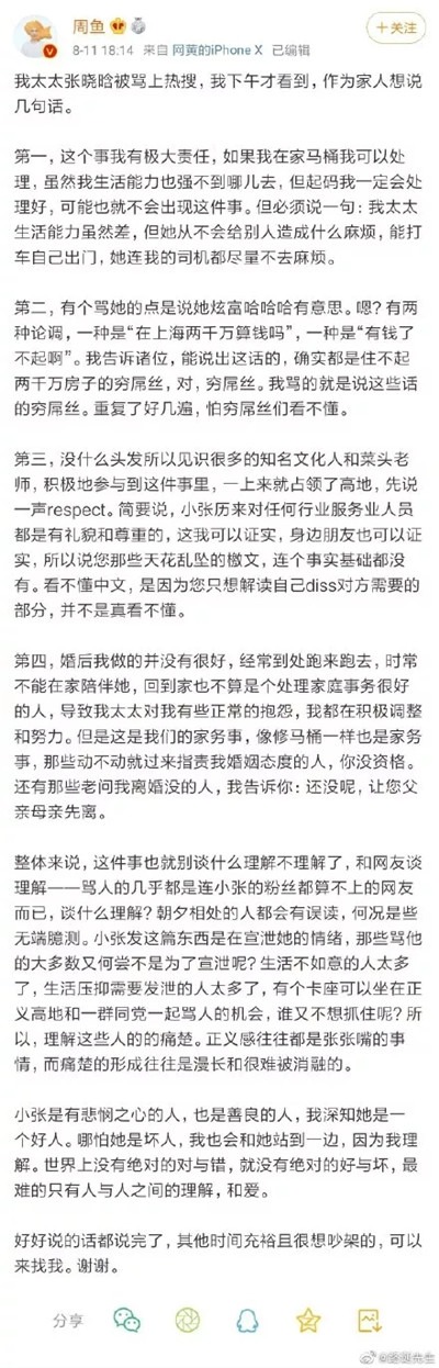 之后,张晓晗的夫君周鱼又发了长篇的微博“护妻”,火上添油:“能说出这样话的,确实是住不起2000万房子的穷X丝,对,穷X丝,我写的就是,说这些话的穷X丝,重复了好几遍,怕穷X丝们看不懂。”