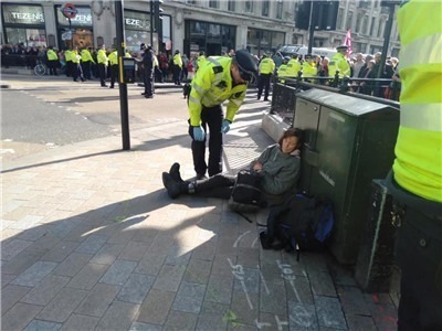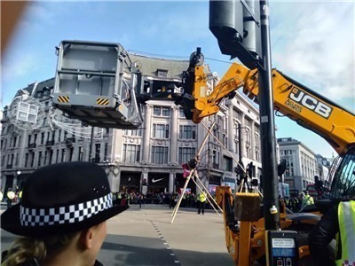 10月18日,是“反抗灭绝”(Extinction Rebellion, XR)运动组织的“秋日起义”行动的最后一天。上午,听说牛津广场(Oxford circus)发生了行动,我坐地铁前往。XR运动成员在凌晨设置了路障,一个路障是用树枝架在转盘小广场中央的架子,两个人爬到了架子上。其他几个人把自己固定到了马路上。我到达现场的时候,警察已经开始一个个“解救”抗议者,其他很多运动成员在一旁围观、唱歌、颁发宣传资料。也有法律咨询员记录下来每个被逮捕的运动成员的名字,确保被逮捕者了解法律权益和受到公正的法律裁决。