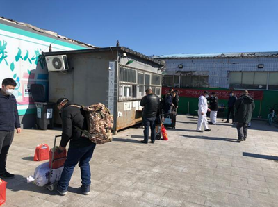 3月4日上午11点,斑驳的公交车广告牌前,稀疏的站着几人,背后则是绵延百余米一层楼高的小店铺,其中面馆、小笼包等店铺均已关门,只有摩托车修理店等几家店铺半掩着卷闸门,店铺前也早已被快递三轮车和堆砌的快递所占据。这是地处北京和河北燕郊交界处的的皮村。在多数企业复工下,这里的工人仍面临着自己的各种难题。返工人员在村口会被拦截并办理出入证。负责办理出入证的工作人员告知,首次返京需要让房东到村口来接才能办理出入证,并且需要在家隔离十四天。很多返工人员在村口处,用小拖车拖着一麻袋物品、拖着行李箱的、提着家乡特产,都在默不作声等待着房东的到来。