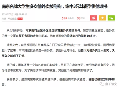 从5月份开始,南京雨花台某小区便连续发生外卖被偷案件。警方调查后发现,偷外卖的是一个正在复习考研的大学生周某。他有据可查的偷外卖行为就有10多次。据他交代,自从发现现在外卖都放在门卫窗口后便偷过一次,当时没被发现。随后他便胆大了起来,常常路过就会顺走一份外卖,拿到什么吃什么。他自以为偷外卖无人追究,久而久之就成了习惯。据了解,周某还是一个知名大学的本科生,目前正在准备考研,他兄弟姐妹有四个,因为他读书比较好,为了供他读本科读研究生,其他三个兄弟姐妹都辍学了。