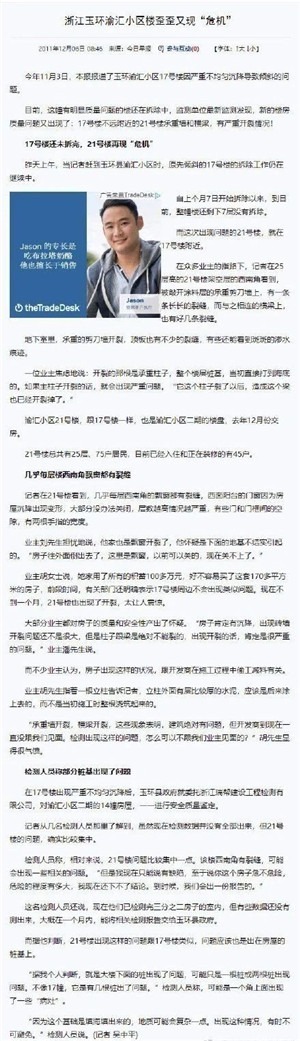 其实早在2011年,今日早报和中国广播网对此小区的报道中提到,该小区楼房曾出现沉降倾斜似中国式"比萨斜塔"和承重墙出现多处裂缝等问题。
