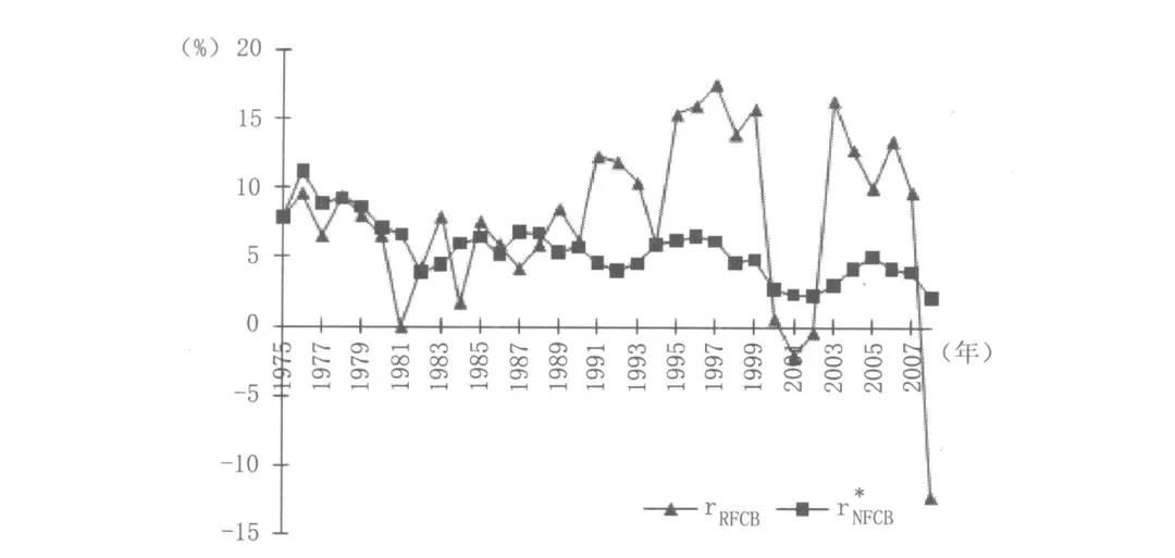 图2 表明:(1)r *N FCB 基本上与rNFCB 同期波动。这说明NFCB 部门的金融活动与实体经济活动具有很强的相关性;(2)r *NFCB 的波动幅度明显大于rN FCB , 其波动幅度在20 世纪80 年代有所减小, 但之后不断增大。这说明NFCB 部门的金融不稳定性随着金融活动的增加逐渐加强。(3)r*NFCB 在长期中趋于下降。1975 —1981 年r*N FCB 高于rNFCB , 此后始终低于后者。同时, 二者的差距在1982 —1990 年基本稳定在约2 %, 在1991 —2008 年逐渐增至4.94 %。这说明NFCB 的金融活动在1975 年至80 年代初开始增加, 在80 年代基本保持稳定, 1991 年以后快速增加。这证实了我们对NFCB 部门金融活动变化的判断。