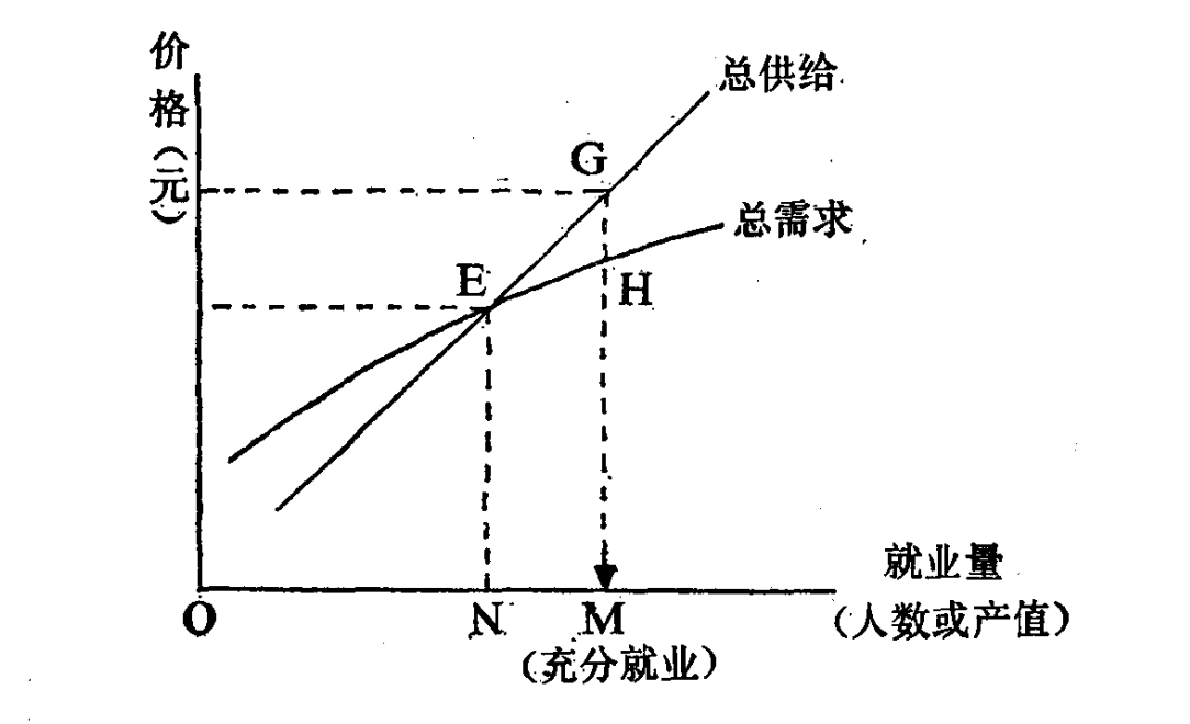 要消除非自愿失业,就业人数应达到OM,但资本家雇用这么多工人,生产这么多产品除了生产费用,还有包括高额垄断利润,需索取GM的总价格;而预期在市场上可售得的总价格仅为HM,存在HG的缺口,这就是不足的部分。资本家阶级不得不减少生产,当雇佣的工人数减少到ON时,资本家阶级对社会产品要求的卖价,正好同市场销售预期能实现的价格相等,均衡于E点,非自愿失业人数为NM,在凯思斯的经济体系中,就业量或者国民生产总值的水平就是这样决定的。